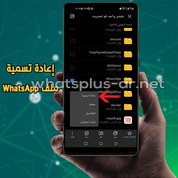 - ثانيًا : تغير اسم ملف واتساب : المرحلة الثانية سوف يكون عليك تغير اسم ملف الواتس اب ، و حتى تقوم بذلك سوف يستوجب عليك الدخول الي ملفاتي –< وحدة التخزين الداخلية –< من شريط البحث قم بالبحث عن ملف اسمه Whatsapp ثم اضغط ضغط مطول عليه –< اختر من الثلاث نقاط الموجودة في الأعلى إعادة تسمية –< قم بتغيير Whatsapp الي WhatsApp2Plus .